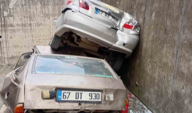 Zonguldak'ın Alaplı İlçesi Karaağaç Mahallesi'nde meydana gelen kazada, rampada geri doğru kayan bir otomobil yaklaşık 8 metrelik istinat duvarından düşerek park halindeki başka bir aracın üzerine çıktı.