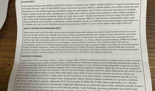 Yozgat'ta yaşayan Ekrem Ünal, yaklaşık 1 yıl önce aldığı Reeder marka telefonunun bozulması üzerine firmaya müracaat etti. Telefonunu değiştirmek istedi ancak aynısından bulunmadığı için 4 bin lira fark ücreti vererek üst modelini aldı. İkinci telefonda da aynı sorunu yaşayan Ünal, tekrar firmaya başvurdu. Şu an elinde firmadan aldığı dördüncü telefonu bulunan Ünal, değiştirilen hiçbir telefonu kullanamadı. Tüketici Hakem Heyeti'ne giderek mağduriyetinin giderilmesi için şikayette bulundu.