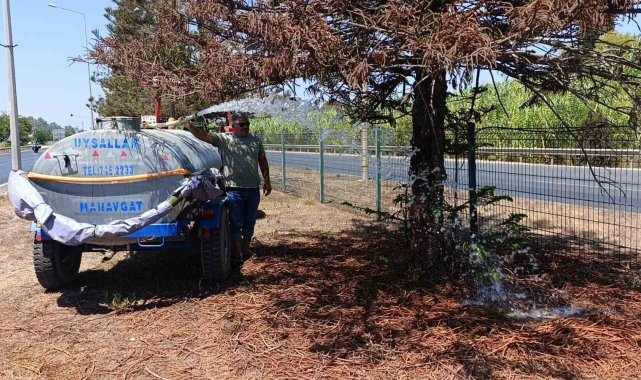 Antalya'nın Manavgat ilçesi D-400 Karayolu üzerindeki refüjlerde bulunan ağaçlar ile bitkilerin sulama ve bakımı yapılmayınca kurumaya başladı. 20 yıllık ağaçların kurumasına seyirci kalmayan mahalle sakinleri traktörlerinin arkasına taktığı tankerler ile mahallelerinin sınırlarında kalan refüjleri sulamaya başladılar.