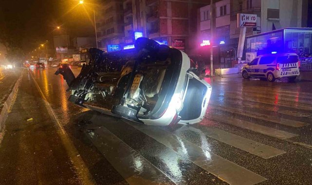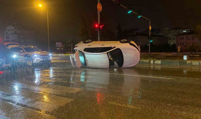 Refüje çarpıp yan yatan otomobilde bulunanların burnu bile kanamadı
