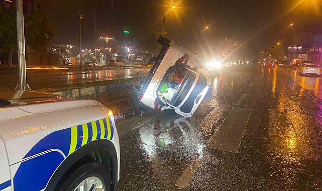 Antalya'nın Serik ilçesinde kontrolden çıkan bir otomobilin refüje çarparak yan yatması sonucu meydana gelen kazada, sürücü ve yolcu yara almadan kurtuldu.