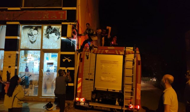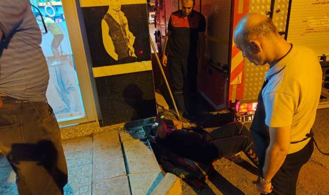 Hatay'da bir iş yerinin reklam panosuna sıkışan kedi, itfaiye ekiplerinin titiz çalışmasıyla kurtarıldı.
