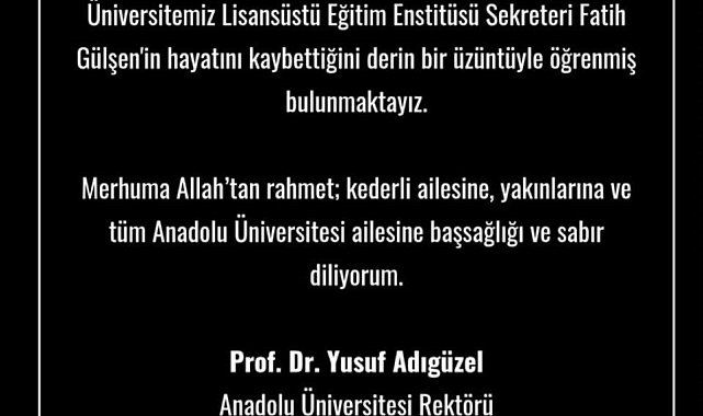 Anadolu Üniversitesi Rektörü Prof. Dr. Yusuf Adıgüzel, Lisansüstü Eğitim Enstitüsü Sekreteri Fatih Gülşen'in vefat etmesi sebebiyle bir taziye mesajı yayımladı.