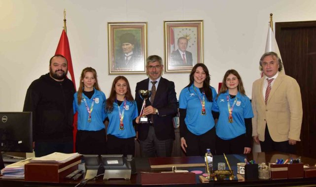 Rektörlük makamında gerçekleşen ziyarette, şampiyon takım sporcuları Hazal Burun, Ceyda Kömür, Gülçin Balık, Meltem Yaka ve Songül Lök kupa ve madalyalarıyla birlikte hazır bulundu. Sporculara, Spor Bilimleri Fakültesi Dekanı Prof. Dr. Özcan Saygın ile takım antrenörü Arş. Gör. Kaan Salman da eşlik etti.