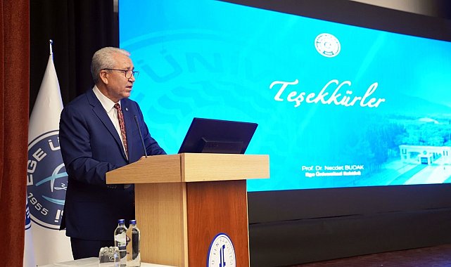 Ege Üniversitesi Fen Fakültesi Konferans Salonunda düzenlenen toplantıya, Rektör Prof. Dr. Necdet Budak'ın yanı sıra üniversite üst yönetimi, senato üyeleri, akademik ve idari çalışanlar ile öğrenciler katıldı.