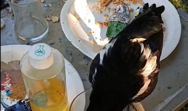 Eskişehir'de parkta resim yaparken bir karga tarafından öncesi fırçası sonra boyası çalınan ressam, sevimli hayvanın hallerini cep telefonu ile kaydetti.