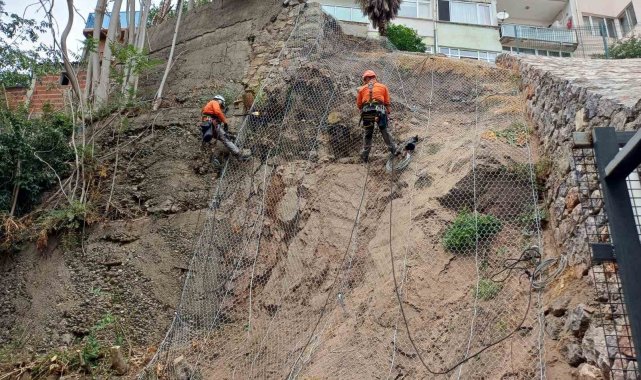Kocaeli Büyükşehir Belediyesi, İzmit Akçakoca Mahallesi'nde can ve mal güvenliğini tehdit eden riskli bir alanda kapsamlı bir çalışmayı tamamladı. Eğimli arazi üzerinde, toprak ve taşların düşerek çevreye zarar vermesini önlemek amacıyla, çelik güçlendirme halatlarıyla desteklenen dayanıklı bir çelik ağ sistemi kuruldu.