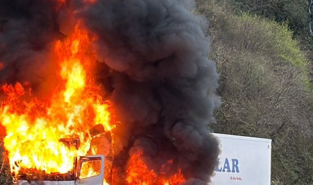 Rize'nin Pazar ilçesinde seyir halindeyken arızalanan tır alev alev yandı.