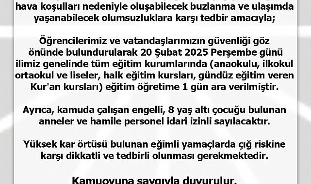 Rize Valiliği tarafından yapılan açıklamada, "İlimiz genelinde devam eden yoğun kar yağışı ve soğuk hava şartları nedeniyle oluşabilecek buzlanma ve ulaşımda yaşanabilecek olumsuzluklara karşı tedbir amacıyla, öğrencilerimiz ve vatandaşlarımızın güvenliği göz önünde bulundurularak 20 Şubat 2025 Perşembe günü ilimiz genelinde tüm eğitim kurumlarında eğitim ve öğretime 1 gün ara verilmiştir" ifadelerine yer verildi.