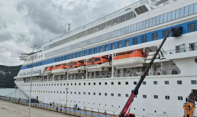Rusya'dan yolcu taşıyan dev Astoria Grande gemisi, geldiği Amasra Limanı'nda filikaları indirip, testlerden geçirilirken, geminin gövdesinde genel bakım gerçekleştirildi.