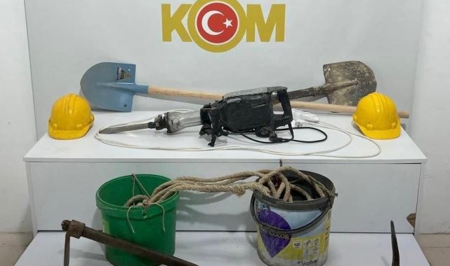 Kazı alanında ve ikamette yapılan aramalarda kaçak kazıda kullanılan çok sayıda malzeme ele geçirildi. Polis ekipleri 1 adet kazıcı, 3 adet kürek, 2 adet baret, 2 adet iniş takımı, 2 adet plastik kova, 1 adet 5 metrelik elektrik kablosu, 1 adet 12 metrelik halat ve 2 adet kazma ele geçirdi.
