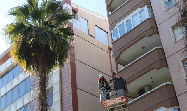 Aydın'ın Efeler ilçesinde etkili olan rüzgar sebebiyle bir binanın cephesi koparak kaldırıma düştü. Şans eseri kimsenin yaralanmadığı olaya hızla müdahale eden itfaiye ekipleri, sallanan cephe parçalarını sökerek tehlikeyi ortadan kaldırdı.
