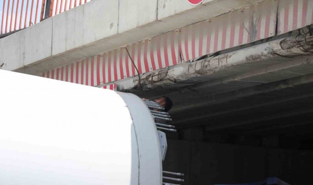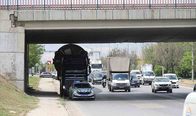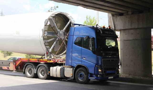 Eskişehir'de taşınan rüzgâr türbinin kanadı, üst geçide sıkıştı.