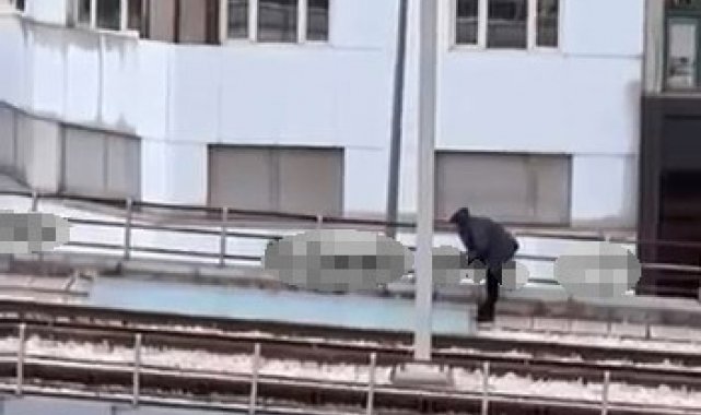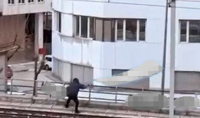 Bursa'da şiddetli rüzgarın kopardığı tabela metro raylarına kadar sürüklendi. Tabelayı kaldırmak için treni durdurup raylara inen vatmanın yaşadığı tehlikeli anlar yürekleri ağza getirdi.