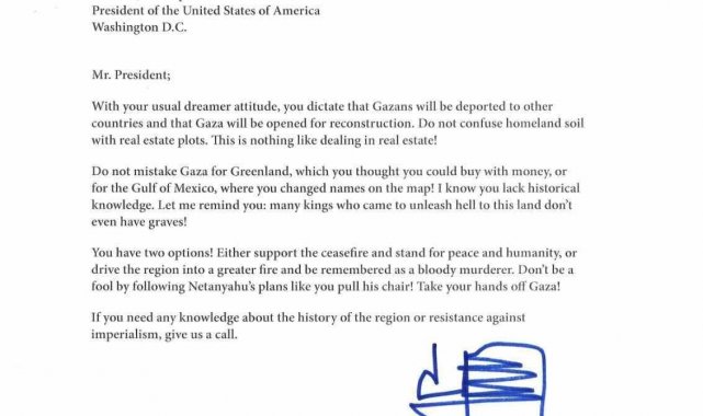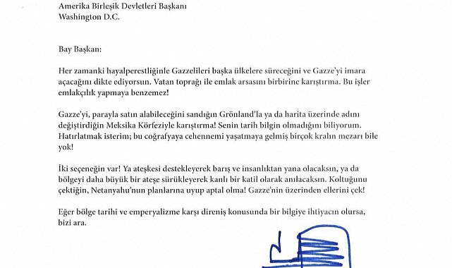 "Bay Başkan: Her zamanki hayalperestliğinle Gazzelileri başka ülkelere süreceğini ve Gazze'yi imara açacağını dikte ediyorsun. Vatan toprağı ile emlak arsasını birbirine karıştırma. Bu işler emlakçılık yapmaya benzemez. Gazze'yi, parayla satın alabileceğini sandığın Grönland'la ya da harita üzerinde adını değiştirdiğin Meksika Körfeziyle karıştırma. Senin tarih bilgin olmadığını biliyorum. Hatırlatmak isterim; bu coğrafyaya cehennemi yaşatmaya gelmiş birçok kralın mezarı bile yok. İki seçeneğin var. Ya ateşkesi destekleyerek barış ve insanlıktan yana olacaksın, ya da bölgeyi daha büyük bir ateşe sürükleyerek kanlı bir katil olarak anılacaksın. Koltuğunu çektiğin, Netanyahu'nun planlarına uyup aptal olma. Gazze'nin üzerinden ellerini çek! Eğer bölge tarihi ve emperyalizme karşı direniş konusunda bir bilgiye ihtiyacın olursa bizi ara."
