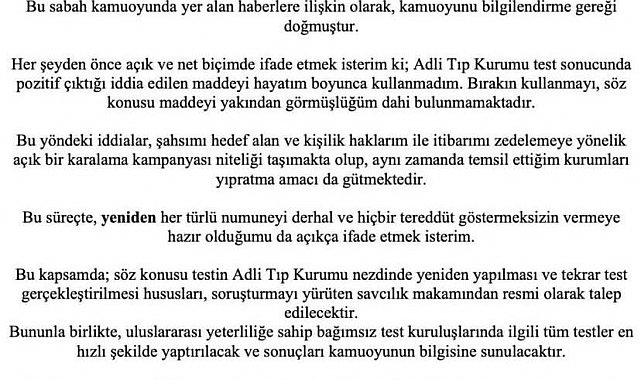 "Pozitif çıktığı iddia edilen maddeyi hayatım boyunca kullanmadım"