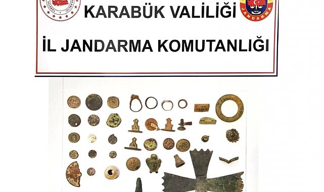 İl Jandarma Komutanlığı ekipleri, Safranbolu Cumhuriyet Başsavcılığı koordinesinde Toprakcuma mevkiinde bir aracı durdurdu. Araçta ve iki şahsın üzerinde yapılan aramada 14 adet sikke, 9 adet mühür, 3 adet iğne, 4 adet yüzük, 7 adet obje, 2 adet haç ile birer adet ok ucu, ağırşak, toka ve melek figürü büstü olmak üzere toplam 43 parça tarihi eser ele geçirildi. Gözaltına alınan şüpheliler jandarmadaki işlemlerinin ardından adliyeye sevk edildi.