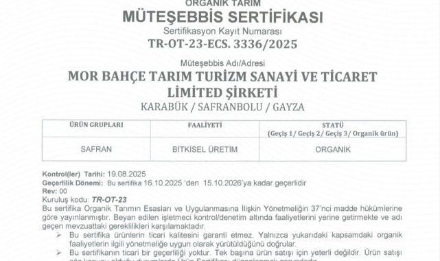 Altuntepe, alınan belgenin bölge tarımı açısından önemli bir dönüm noktası olduğunu vurgulayarak, organik üretim anlayışıyla hem ürün kalitesini artırmayı hem de Safranbolu safranını ulusal ve uluslararası pazarlarda daha güçlü bir konuma taşımayı hedeflediklerini kaydetti.