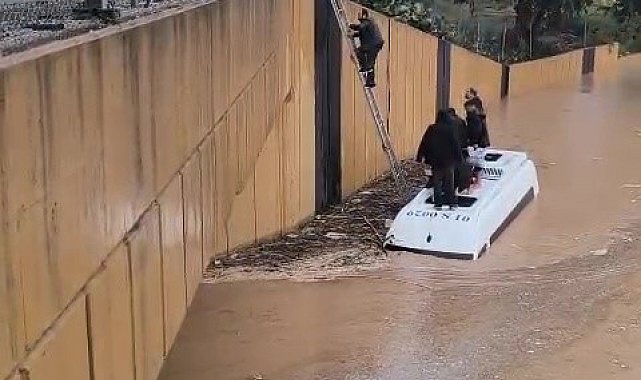 Sağanak yağmura servis aracında yakalananlar merdivenle kurtarıldı