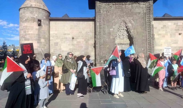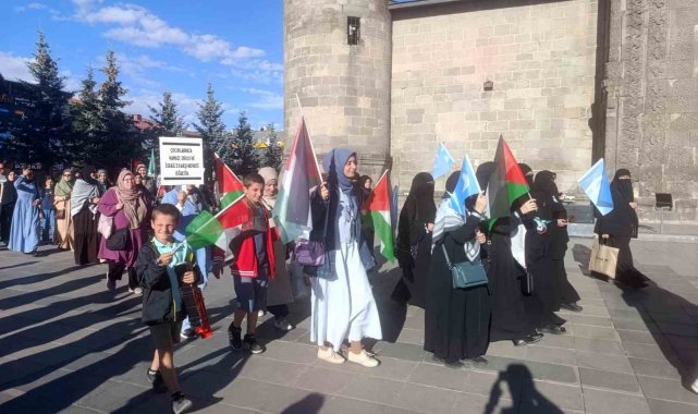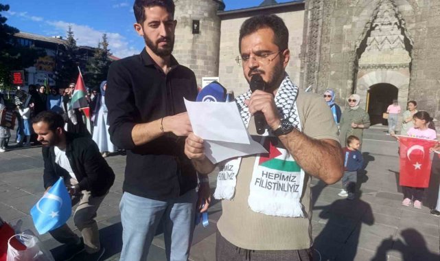 Yakutiye ilçesi tarihi Lala Paşa Cami önünde bir araya gelen tıp fakültesi öğrencileri ile sağlık çalışanları, Türk ve Filistin bayrakları eşliğinde taşıdıkları döviz ve pankartlarla Yakutiye Medresesi önüne kadar yürüdü.