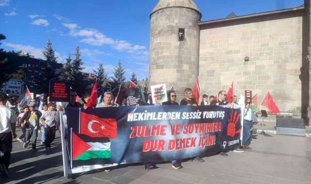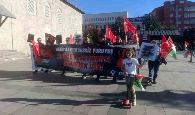 Erzurum'da hekimler ve sağlık çalışanları, İsrail'in Gazze'ye yönelik saldırılarını protesto etmek ve zulmüne dikkati çekmek amacıyla yaptıkları sessiz yürüyüşlerini 96. haftada da sürdürdü.