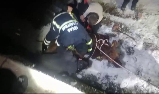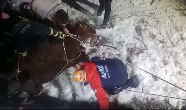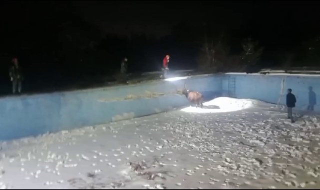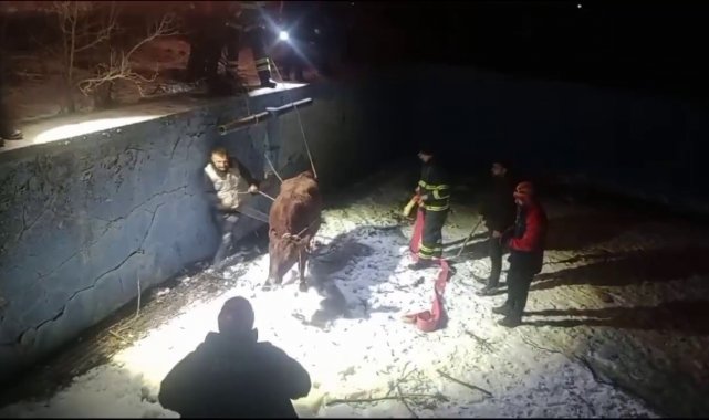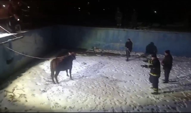 Sivas'ta sahibinin elinden kaçarak boş havuza düşen inek, AFAD ve itfaiye ekipleri tarafından kurtarıldı.