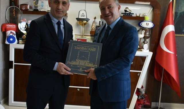 BİK Şube Müdürü Tahsin Şahin, Erzurum Gençlik ve Spor İl Müdürü Levent Çakmur'a, Bir Medeniyetin varoluş mücadelesi Taksim Camii basından ikdibaslar adlı kitabı hediye etti.