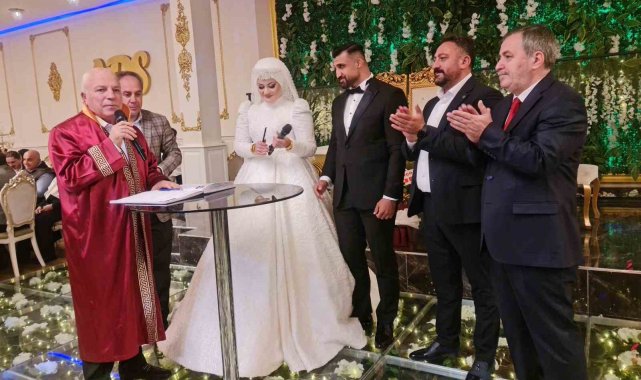 Nikah töreninin ardından evlilik cüzdanını genç çifte takdim eden Seken, takı hediye ettikten sonra Beyza-Eren Dursun çiftine ömür boyu sağlık ve mutluluklar diledi.