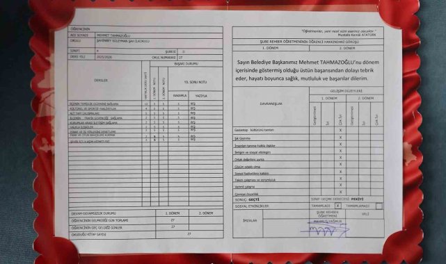 Hazırlanan karnede, Başkan Mehmet Tahmazoğlu'nun eğitim, spor ve sosyal alanlarda yaptığı hizmetlere en yüksek not olan 5 puan verilirken, okul ziyaretinden duyulan memnuniyet de teşekkür belgesiyle ifade edildi. Başkan Mehmet Tahmazoğlu, öğrencilerin bu anlamlı jestinden büyük mutluluk duyduğunu belirterek çocuklara teşekkür etti.