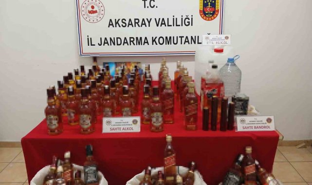 Aksaray'da sahte alkol üretimi yapılan eve operasyon düzenleyen jandarma litrelerce sahte içki ele geçirirken, sahte alkol üretimi yapıp piyasaya sattığı öğrenilen şahıs yakalandı.