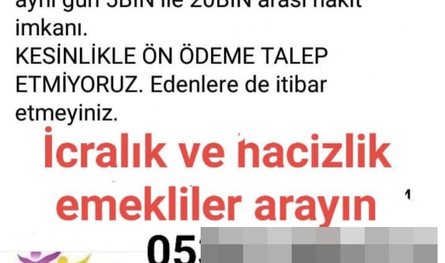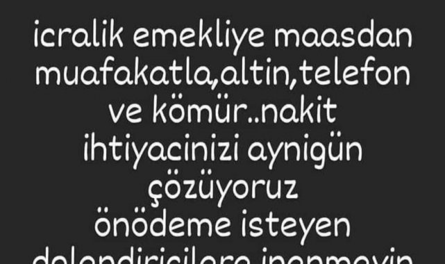 Dolandırıcılar konusunda uyarıda bulunarak güven telkin eden paylaşımlardan birinde ise, "İcralik emekliye maaştan muafakatla, altın, telefon ve kömür. Nakit ihtiyacınızı ayni gün çözüyoruz. Ön ödeme isteyen dolandırıcılara inanmayın" ifadeleri kullanıldı.