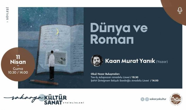 Aynı gün, Yazar Kaan Murat Yanık, 11 Nisan Cuma günü "Dünya ve Roman" başlıklı söyleşisiyle öğrencilerle bir araya gelecek. Söyleşi, saat 10.30'da Tes-İş Adapazarı Anadolu Lisesi'nde, 14.00'te ise Şehit Üsteğmen Selçuk Esedoğlu Anadolu Lisesi'nde gerçekleşecek. Okur-yazar buluşmaları kapsamında düzenlenen bu etkinlikte, romanın dünyası ve yazarlık serüveni üzerine keyifli bir sohbet yapılacak. Büyükşehir, tüm kültür ve sanat dostlarını 11 Nisan Cuma günü düzenlenecek iki farklı etkinliğine davet etti.