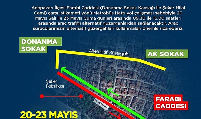 Metrobüs hattı çalışmaları sebebi ile Sakarya Büyükşehir Belediyesi tarafından araç trafiğine geçici olarak kapatılan Adapazarı Farabi Caddesi'nde çalışmalar devam edecek. Güzergah çalışmalar çerçevesinde 20 Mayıs Salı ve 23 Mayıs Cuma günleri arasında saat 09.30 ile 16.00'da araç trafiği alternatif güzergahlardan yapılacak.
