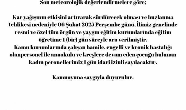 Sakarya'da sabah saatlerinde başlayan ve etkisini artırarak sürdürmesi beklenen kar yağışı sebebi ile okullar 1 gün tatil edildi. Konuya ilişkin Sakarya Valiliği'nden yapılan yazılı açıklamada, "Son meteorolojik değerlendirmelere göre; kar yağışının etkisini artırarak sürdürecek olması ve buzlanma tehlikesi nedeniyle 6 Şubat 2025 Perşembe günü, ilimiz genelinde resmi ve özel tüm örgün ve yaygın eğitim kurumlarında eğitim öğretime 1 (bir) gün süreyle ara verilmiştir. Kamu kurumlarında çalışan hamile, engelli ve kronik hastalığı olan personel ile anaokulu ve kreşlere devam eden çocuğu bulunan kadın personellerimiz 1 gün idari izinli sayılacaktır" denildi.