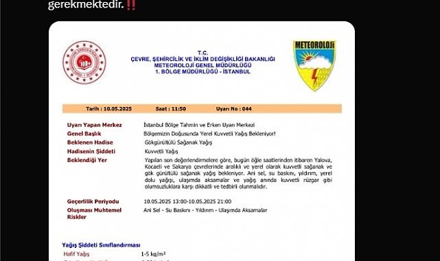 Sakarya Valiliği, meteorolojik verilere göre şehir genelinde bugün öğle saatlerinden itibaren beklenen kuvvetli sağanak yağışa karşı uyarıda bulundu.