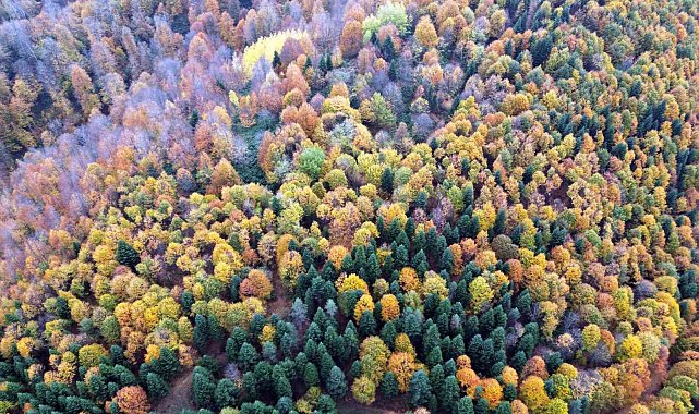 Sakarya'nın Akyazı ilçesinde sonbaharın gelişiyle birlikte ormanlık alanlar sarı, turuncu ve kızılın tonlarıyla adeta bir renk şölenine dönüştü. Bölgede ortaya çıkan eşsiz güzellik havadan görüntülendi.