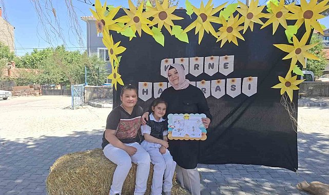 Okul bahçesinde hazırlanan karne hatırası panosu önüne hasat zamanı olması nedeniyle okul idaresi tarafından iki balya saman konuldu. Gülümseten saman balyalı karne hatırası panosu çocuklarıyla resim çektirmek isteyen velilerin akınına uğradı.