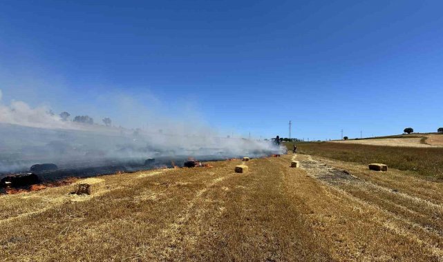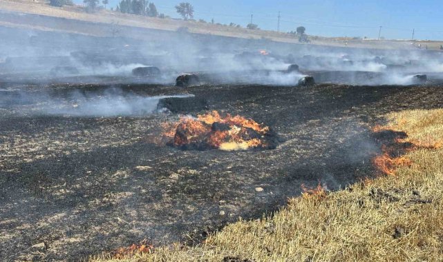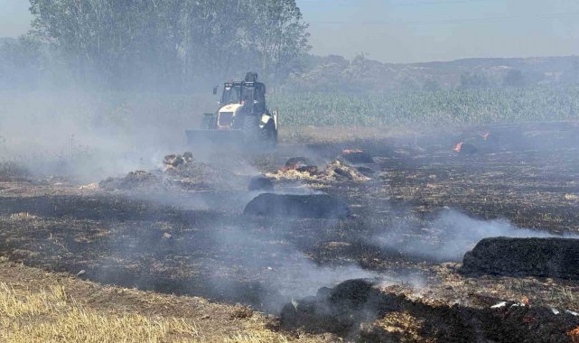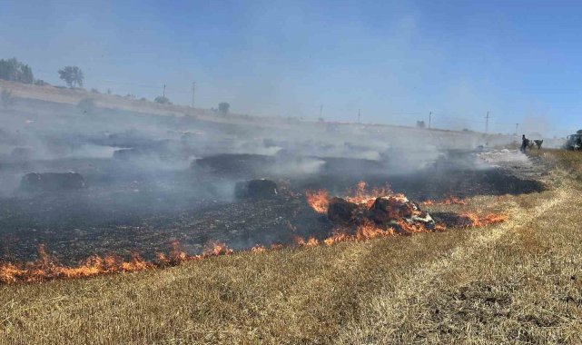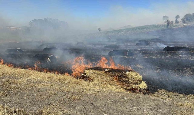 Yangında, tarlada bulunan çok sayıda saman balyası ile ekili araziler büyük ölçüde zarar gördü.