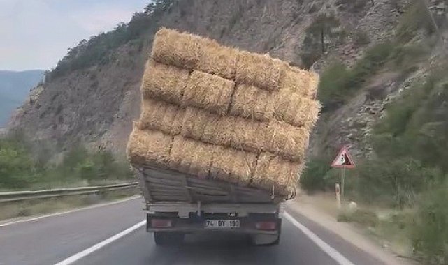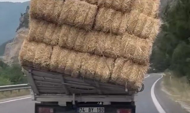 Edinilen bilgiye göre, Karabük-Zonguldak kara yolunda seyreden bir kamyonun dorsesine yüklenen saman balyalarının dengesiz ve aşırı yüklü olduğu görüldü. Yükün ağırlığı nedeniyle sağa doğru eğilen kamyon, trafikteki diğer sürücülerde tedirginliğe yol açtı.