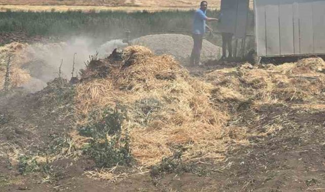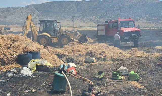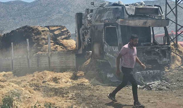 Afyonkarahisar'ın Şuhut ilçesinde saman balyası yüklü tırın elektrik tellerine temas etmesiyle çıkan yangında araç küle dönerken, araziye sıçrayan yangın itfaiye ekiplerinin ve vatandaşların yoğun çabasıyla büyümeden söndürüldü.