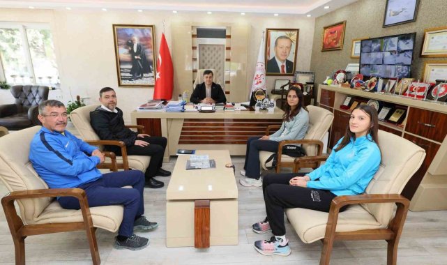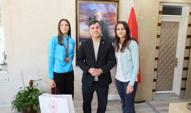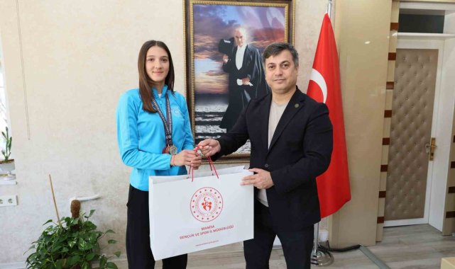 Manisa Gençlik ve Spor İl Müdürü Yunus Öztürk, Bursa'da düzenlenen Nejat Kök U16 Türkiye Atletizm Salon Şampiyonası'nda 3 adım atlama branşında Türkiye birincisi olarak altın madalya kazanan Manisalı sporcu Eylül Aygül'ü ve antrenörü Döndü Yeter'i makamında ağırlayarak tebrik etti.