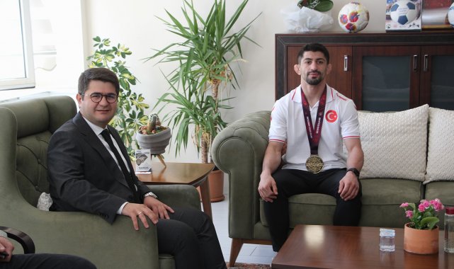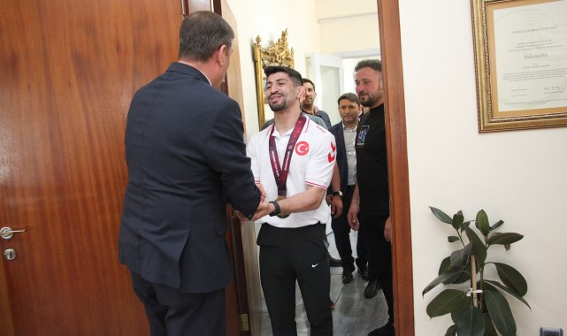 Avrupa Güreş Şampiyonu Kerem Kamal, kazandığı büyük başarının ardından memleketi Manisa'nın Kula ilçesinde Kaymakam Ömer Ahmet Özdemir ve Kula Belediye Başkanı Hikmet Dönmez'i makamlarında ziyaret etti.