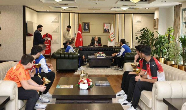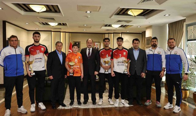 Erkek voleybol takımı il müsabakalarında 5 kategoride şampiyonluk yaşayan Şanlıurfa Büyükşehir Belediyespor Erkek Voleybol Takımının kaptanları, şampiyonluk kupaları ile birlikte Büyükşehir Belediye Başkanı Mehmet Kasım Gülpınar'ı ziyaret etti.