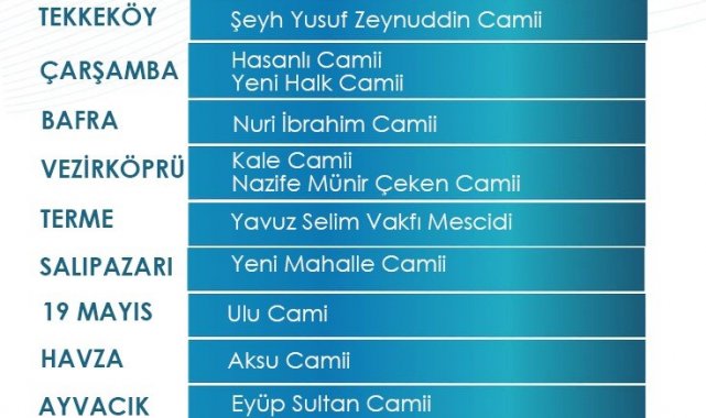 Canik: Karşıyaka Mahallesi Mekke Camii. Tekkeköy: Şeyh Yusuf Zeynuddin Camii. Çarşamba: Hasanlı Camii ve Yeni Halk Camii. Bafra: Nuri İbrahim Camii. Vezirköprü: Kale Camii ve Nazife Münir Çeken Camii. Terme: Yavuz Selim Vakfı Mescidi. Salıpazarı: Yeni Mahalle Camii. 19 Mayıs: Ulu Cami. Havza: Aksu Camii. Ayvacık: Eyüp Sultan Camii. Ladik: Bülbülhatun Camii. Kavak: Yeni Cami Mahallesi Camii. Yakakent: Şehit Erdoğan Altınel Diyanet Okuma Salonu. Alaçam: Çarşı Camii.