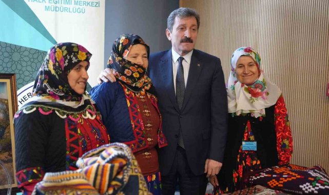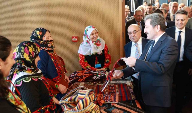 Kadınlar, Samsun Şehit Ömer Halisdemir Salonu'nda düzenlenen Samsun Coğrafi İşaretli Ürünler Sergisine katılarak belleme geleneği ve Tahtaköprü kilimi dokumacılığı hakkında Vali Orhan Tavlı ile ziyaretçilere bilgi verdi.