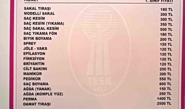 "Sakal tıraşı 180 TL. Modelli sakat tıraşı 300 TL. Saç kesimi 300 TL. Saç kesim ve yıkama 350 TL. Saç-sakal kesim 500 TL. Saç yıkama ve fön 180 TL. Bıyık boyama işlemi 200 TL. Sprey, jöle, vaks, epilasyon, briyantin işlemi 120 TL. cilt bakımı 250 TL. Manikür 300 TL. Pedikür 500 TL. Saç boyama 800 TL. Yanak ağdası 150 TL. Komple yüz ağdası 250 TL. Perma bin 400 TL ve damat tıraşı da 2 bin 500 TL."