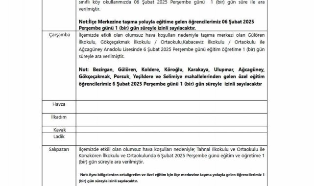 Çarşamba için, "İlçemizde etkili olan olumsuz hava şartları nedeniyle taşıma merkezi olan Gülören İlkokulu, Gökçeçakmak İlkokulu / Ortaokulu,Kabaceviz İlkokulu / Ortaokulu ile Ağcagüney Anadolu Lisesinde Perşembe günü eğitim öğretime 1 gün süreyle ara verilmiştir. Not: Bezirgan, Gülören, Koldere, Köroğlu, Karakaya, Ulupınar, Ağcagüney, Gökçeçakmak, Porsuk, Yeşildere ve Selimiye mahallelerinden gelen özel eğitim öğrencilerimiz 6 Şubat Perşembe günü 1 gün süreyle izinli sayılacaktır."