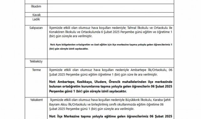 Bafra için, "İlçemizde etkili olan olumsuz hava koşulları nedeniyle taşıma merkezi olan Ortadurak İlk/Ortaokulu, Müstecep İlk/Ortaokulu, Kolay Anadolu Lisesi, Kolay Ortaokulu, Neyzen Tevfik İlkokulu, Örencik İlk/Ortaokulunda Perşembe günü eğitime 1 gün süreyle ara verilmiştir. Not: Bengü Kanlıgüney, Meşelitürkmenler, Elalan, Başaran, Şahinkaya, Esençay, Kabaçukuru, Akalan, Dikencik, Kuşçular, Dikencik Tütüncüler, Darboğaz Okçular Mahalleleri, Köseli Özel Eğitim Meslek Okuluna Gelen 19 Mayıs Aydınpınar Ve Çetirlipınar Mahalleleri, Uluavlu, Çulhakoca, Paşaşeyh, Ortadurak Ortaoğretim ögrencileri, Yakakent Asmapınar mahallelerinden taşıma yoluyla gelen özel eğitim öğrencilerimiz 6 Şubat Perşembe günü 1 gün süreyle izinli sayılacaktır."
