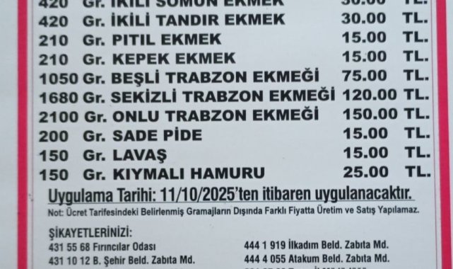 Yeni tarife ile birlikte Samsun genelinde yarından itibaren 420 gram tandır ekmek 30 TL, 1680 gram Karadeniz ekmeği 120 TL, 200 gram sade pide 15 TL, 150 gram lavaş 15 TL ve 150 gram kıymalı hamuru da 25 TL'den satışa sunulacak.