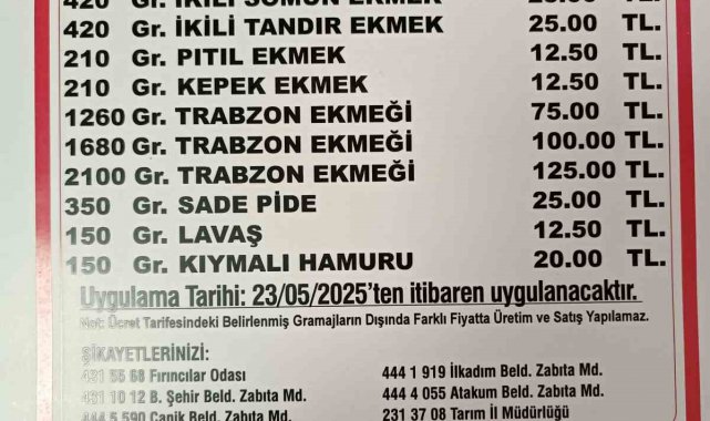 SAMSUN (İHA) – Samsun'da valiliğin itirazı sonrası 12,5 TL'den 10 TL'ye düşürülen ekmek fiyatlarında yeni bir gelişme yaşandı. Samsun Fırıncılar Odası'nın çıkarttığı yeni tarifeyle birlikte Samsun'da yarından itibaren 210 gram ekmek yeniden 12,5 TL'ye satılacak.